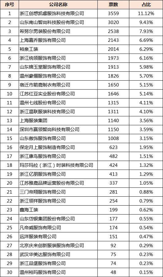 活動自舉辦以來,得到了許多職業(yè)裝企業(yè)的熱烈反響,報名者絡繹不絕。5月28日至6月28日,網(wǎng)絡投票,網(wǎng)絡投票評分占總分值10%,現(xiàn)公布網(wǎng)絡投票結果: