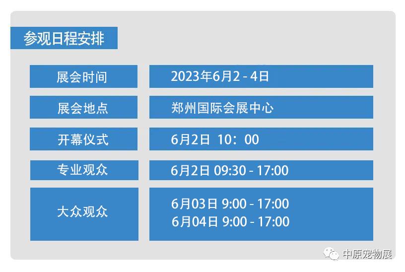 2023中原寵物展分為專業觀眾日與大眾觀眾日,專業日:6月2日,6月3-4日大眾觀眾日現場采用付費模式,如未提前預登記,現場50元/張單人單次票。(請悉知)